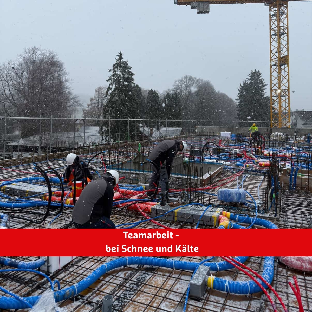 Unsere Mitarbeitenden sind auch bei winterlichen Bedingungen täglich im Einsatz und sorgen dafür, dass Bauprojekte zuverlässig voranschreiten.